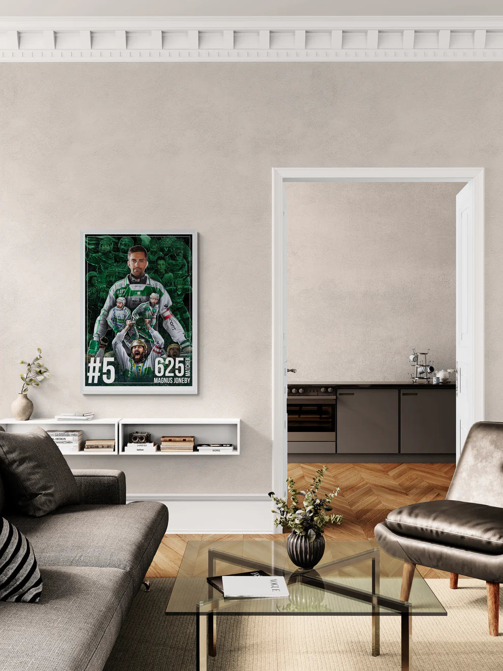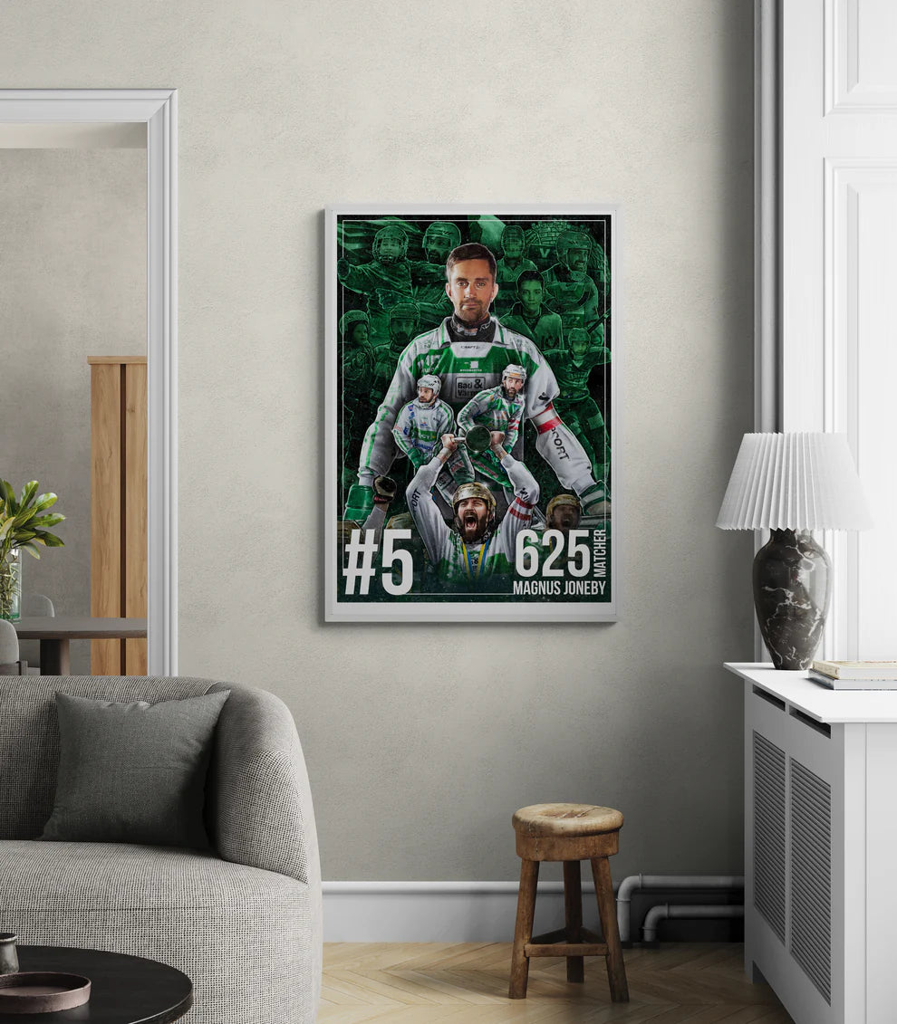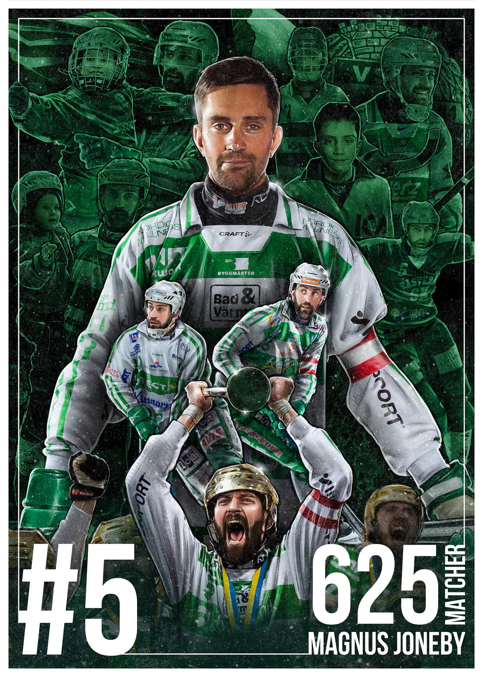 I samarbete med VSK Bandy så har vi gjort denna exklusiva poster för att hylla Magnus Joneby. Men sina 625 matcher så är han en legend för VSK Bandy. Postern är en hyllning till honom. 15 procent per såld tavla går till VSK Bandy.