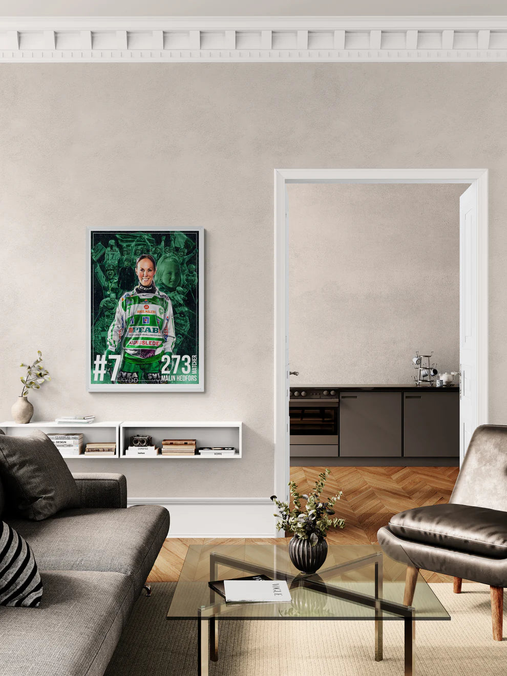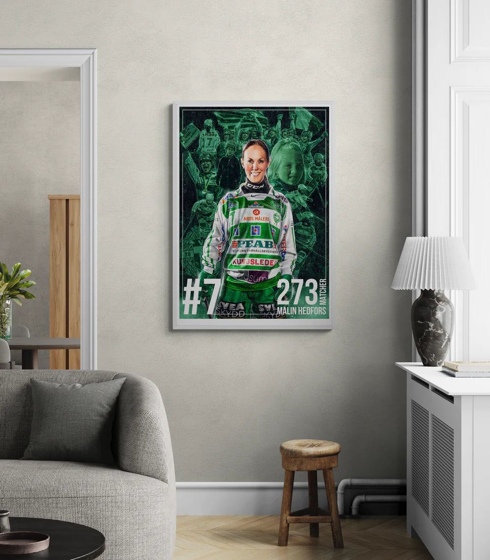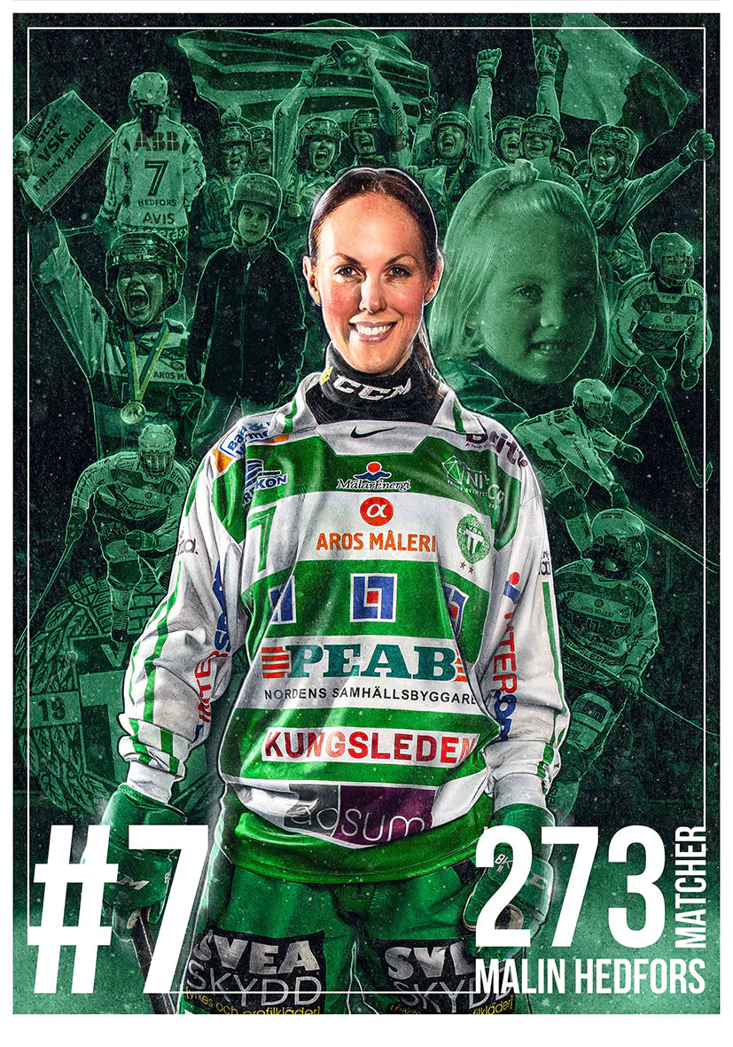 Hyllningsposter till Malin Hedfors från VSK Bandy. Motivet framtaget i samband med att Hedfors tröja nummer 7 hissades upp i taket i ABB Arena Syd.